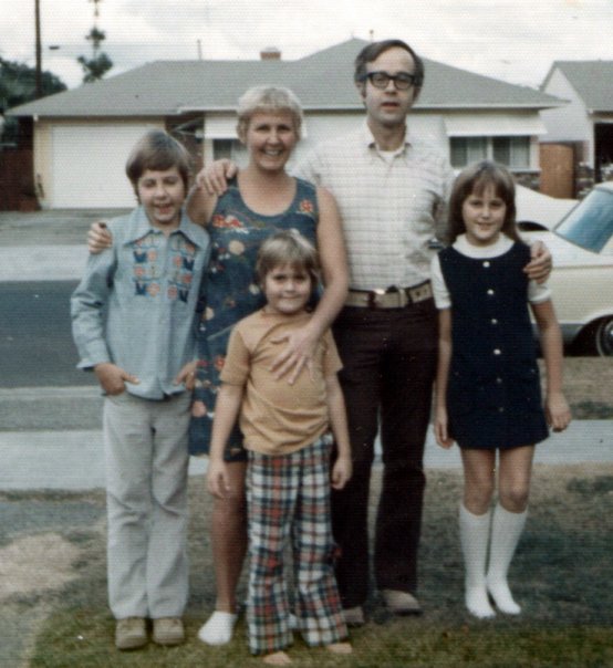 I also noticed, as some of you may have, that we didn’t look a lot alike. Below is a picture of my family taken during the Just Wear Anything period when people no longer cared about what they wore, no matter how plaid it might be. The picture on the left is my doll.